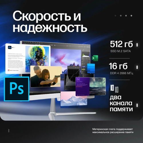 Моноблок 24 дюйма, Intel Core i3 12100, Windows 11pro, SSD 512ГБ, Wi-Fi/Bluetooth, черный