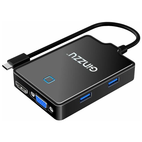 Type C концентратор Ginzzu GR-770UB, 1 порт HDMI, 4 порта USB 3.0, порт VGA, Audio (DC-jack 3,5mm), интерфейсный кабель 35 см, черный. Уцененный товар