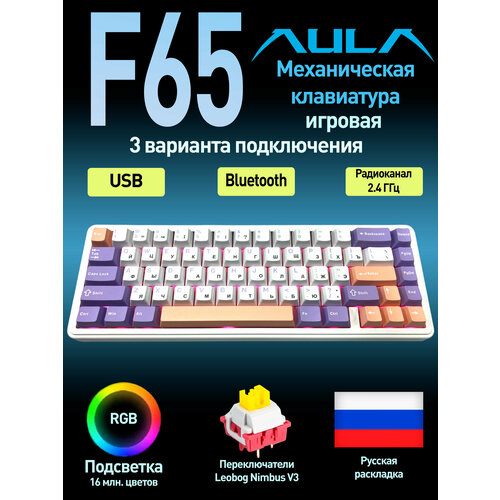 Клавиатура AULA F65 Purple Leobog Nimbus V3 Switch (2983) белый/фиолетовый Русская раскладка USB, Радиоканал, Bluetooth