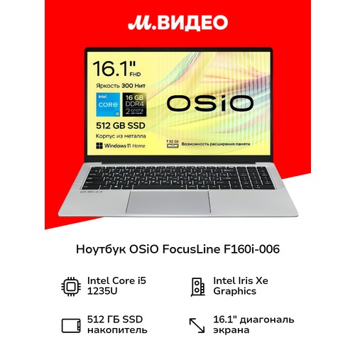 Ноутбук OSIO FocusLine F160i-006 F160I-006, 16.1", 2023, IPS, Intel Core i5 1235U 1.3ГГц, 10-ядерный, 16ГБ DDR4, 512ГБ SSD, Intel Iris Xe graphics, Windows 11 Home, серый