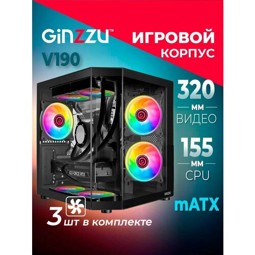 Корпус Ginzzu V190 mATX кубик, 3*12см FRGB FAN закаленное стекло