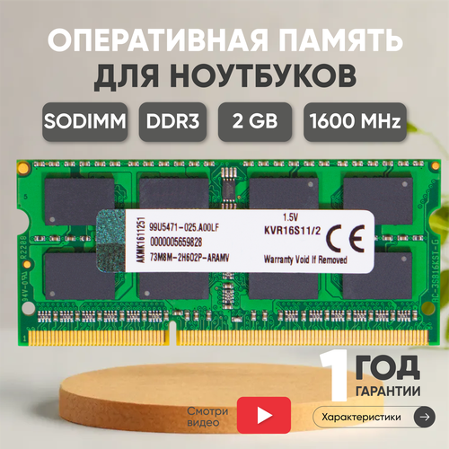 Модуль памяти Kingston SODIMM DDR3, 2ГБ 1600МГц, PC3-12800, CL11 11-11-11-28