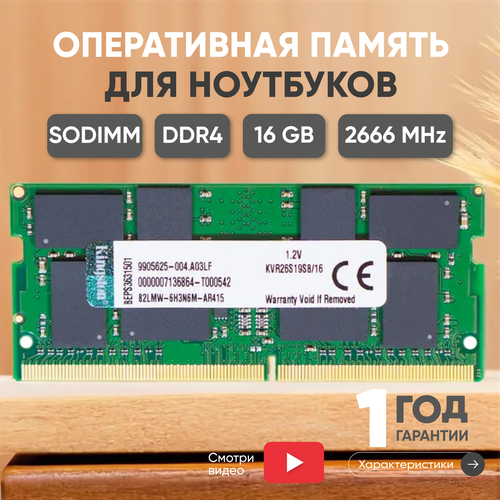 Модуль памяти Kingston SODIMM DDR4, 16ГБ, 2666МГц, 1.2В, PC4-21300, CL19 19-19-19-43