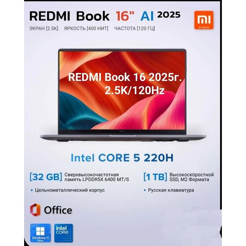 Ноутбук Xiaomi Redmi Book 16 (2025), Intel Core 5 220 H/2.5К- 120Hz /RAM32 ГБ-SSD 512 ГБ, Windows 11+ Office , Русская клавиатура, подсветка клавиатуры, металлический корпус, зарядка Type -c.