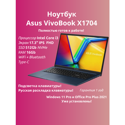17.3"Ноутбук ASUS Vivobook 17 X1704ZA (Intel Core i3-1215U/17.3"/1920х1080/RAM 16G/512GB/Intel UHD Graphics/Win 11 Pro)