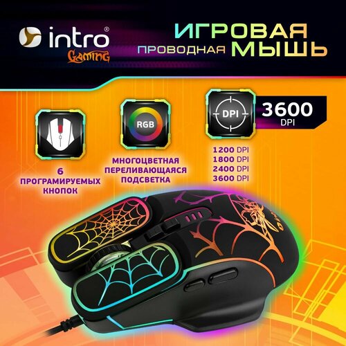 черныйМышь компьютерная игровая проводная Intro MG250 - это полноразмерная мышь с многоцветной подсветкой, которая обеспечивает комфорт и точность в играх.