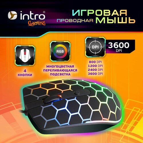 Мышь игровая компьютерная проводная с подсветкой Intro MG278, 4 кнопки, 800-3600dpi, черная
