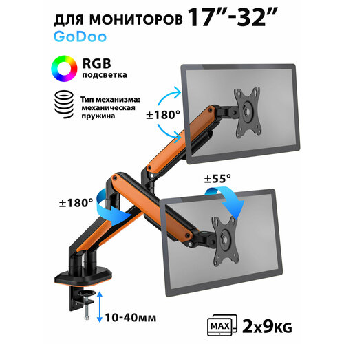 Кронштейн для двух мониторов Godoo 17"-32" дюймов настольный с RGB подсветкой LDT63-C024GL Matte Black & Orange