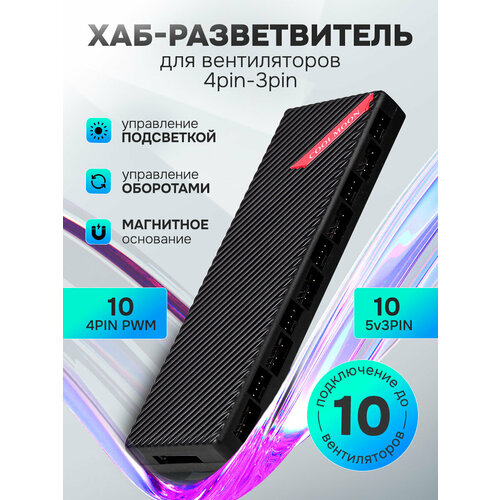 Контроллер COOLMOON на 10 вентиляторов (кулеров) с подсветкой, PWM+ARGB, 4Pin+3Pin, SATA кабель, магнитный низ, черный