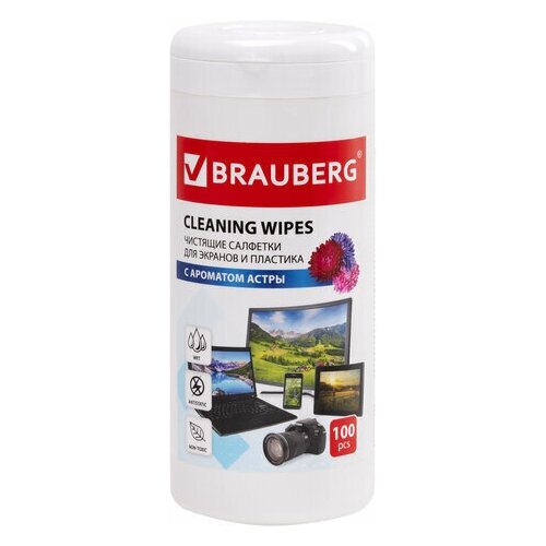 Салфетки для экранов всех типов и пластика BRAUBERG с ароматом "астра", комплект 12 шт, в тубе 100 шт, влажные, 511689
