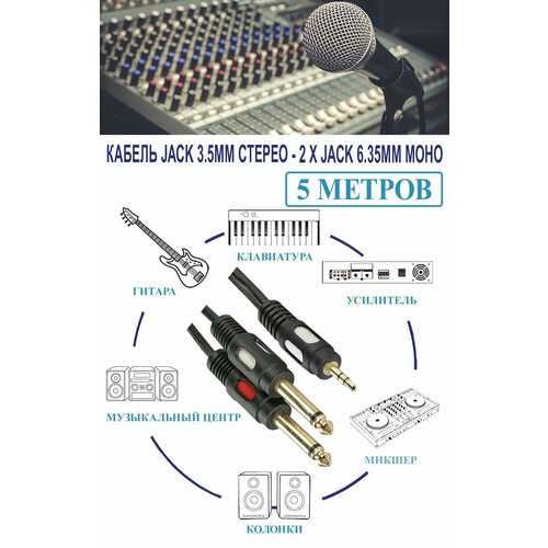 Кабель jack 3.5мм стерео - 2 х jack 6.35мм моно, позолоченный, длина - 5 метров