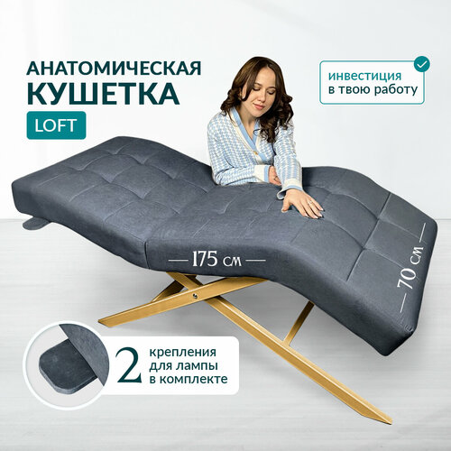 Анатомическая кушетка в стиле Лофт, в салон красоты, золотая ножка, в студию, для наращивания ресниц, для преманентного макияжа, Велюр Цвет Серый