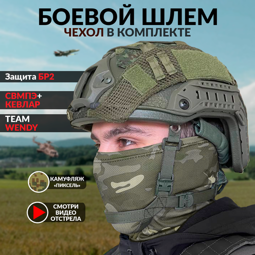 Шлем военный тактический БР 2 с ушами чехол пиксель Арамид зеленый, размер unisex