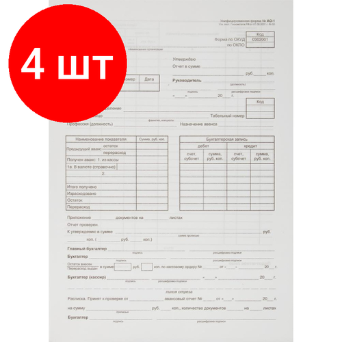 Комплект 4 упаковок, Бланк Авансовый отчет форма АО-1 А4 1у/5кн по 100л газетка(упаковка крафт)