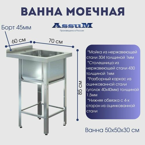 Ванна моечная (мойка с бортом) 600х700х850мм, из нержавеющей стали отверстием под смеситель, разборная, уголок оцинковка