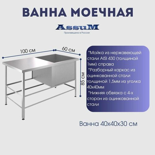 Ванна моечная (мойка без борта) 1000х600х850мм, из нержавеющей стали отверстием под смеситель, разборная, уголок оцинковка