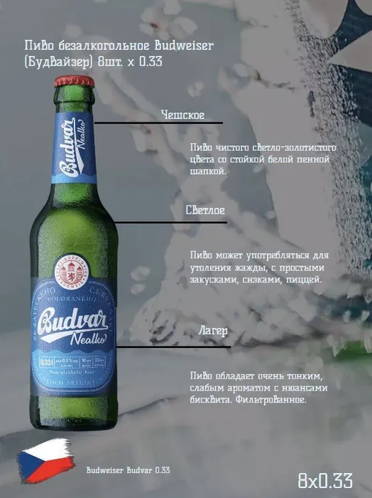 Пиво безалкогольное Budweiser (Будвайзер) Budvar 0,33 л х 8 бут.