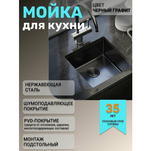 Мойка из нержавеющей стали, подстольный монтаж 45х45 (3, 0) выпуск 3 1/2 20см с сифоном (черный графит)