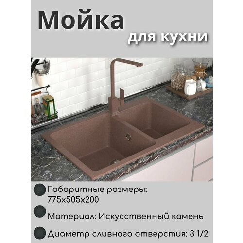 Мойка для кухни врезная прямоугольная двухчашевая, из искусственного камня, цвет коричневый, 775*505*200мм, грубина чаши 170/200 мм