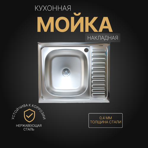 Мойка для кухни накладная, нержавеющая сталь, 60x50 левая, 0,4 мм