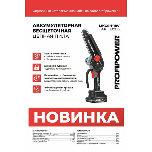 Аккумуляторная бесщёточная цепная пила PROFIPOWER 18B 4Ач (1Акб, шина 12",45зв, шаг 3/8)