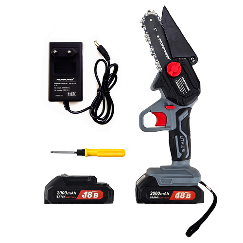 Аккумуляторная бесщёточная цепная пила ProfiPower с функцией автосмазки(Li-ion-2шт 2.0Ач, шина 8",2 цепи в комплекте 45зв. в коробке)