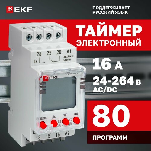 Таймер электронный двухканальный ТЭ-80 AC/DC 24-230В 16А EKF, 80 программ, дисплей, часы реального времени, монтаж на DIN-рейку, можно использовать для подачи школьных звонков