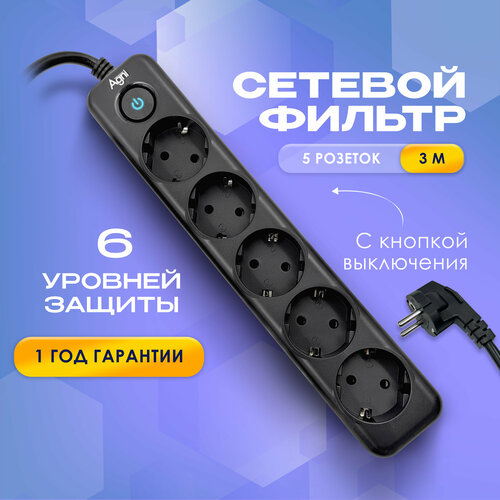 Сетевой фильтр с заземлением на 5 розеток AGNI с выключателем, защитные шторки, 4000 Вт/16 А, удлинитель 3 метра