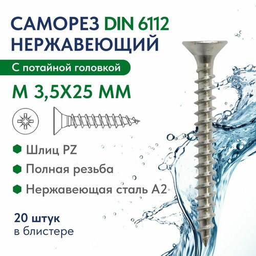 Саморез с потайной головкой крест. шлиц М 3,5Х25 Z нержавеющая сталь A2 ART. 6112 , блистер 20 шт.