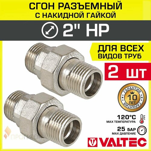 2 шт - Сгон прямой 2" НР разъемный с накидной гайкой VALTEC, латунный / Фитинг резьбовой ДУ 50 с американкой для монтажа труб, арматуры в системе отопления и водоснабжения, VTr.728. N.0009