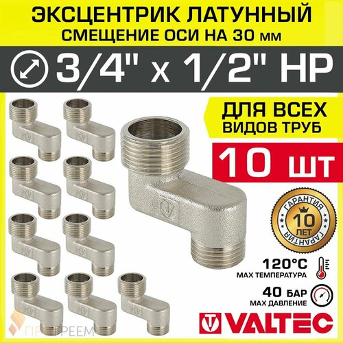 10 шт - Эксцентрик латунный 3/4" х 1/2" НР х 30 мм VALTEC для смесителя / Резьбовой фитинг - телескопический переходник для подключения сантехники со смешением осей соединения, VTr.095. N.0504030