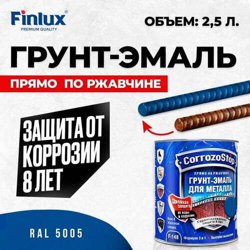 Грунт-эмаль Finlux F-148 Gold по ржавчине 3 в 1, краска по металлу, глянцевое покрытие, 2.5 кг