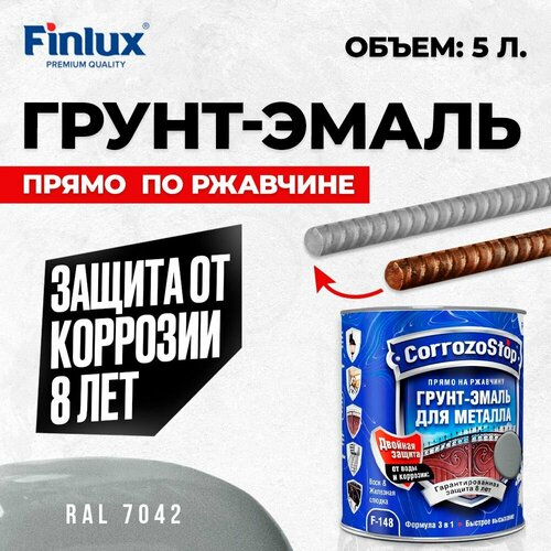 Грунт-эмаль Finlux F-148 Gold по ржавчине 3 в 1, краска по металлу, глянцевое покрытие, 5 кг, цвет серый