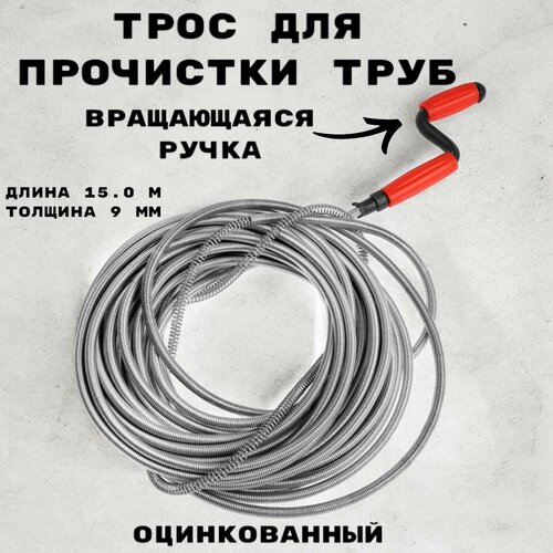 Трос сантехнический оцинкованный с вращающейся ручкой диаметр 9 мм, длина 15 метров