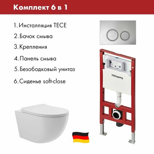 Комплект Инсталляция TECEspring, панель смыва с круглыми кнопками, хром глянцевый+Унитаз подвесной 525*360 безободковый ADT, сиденье Soft-Close, глянцевый, форма овал