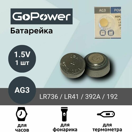 Батарейка GoPower AG3 (LR736, LR41, 392A, 192) Alkaline 1.55V (1 шт)