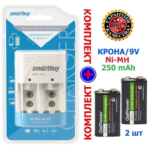 Зарядное устройство для аккумуляторных батареек + 2 шт. Аккумулятор Крона 9V/ 250mAh, перезаряд 1000 циклов/ зарядное устройство Smartbuy SBHC- 505