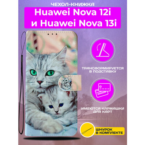 Чехол книжка для Huawei Nova 12i и Huawei Nova 13i / Хуавей Нова 12i и Хуавей Нова 13i с рисунком (Кошка с котёнком)