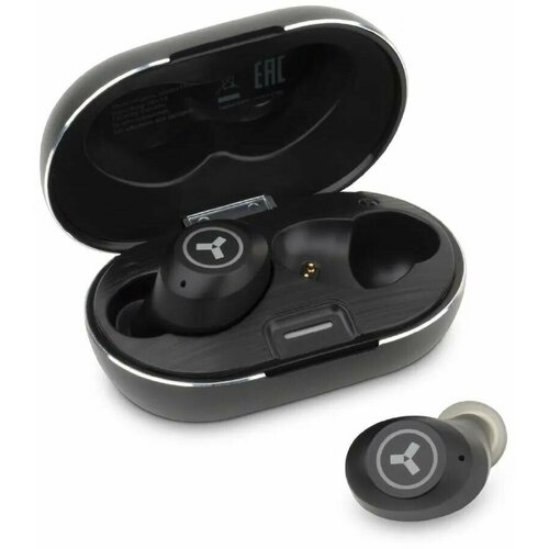 Беспроводные наушники Accesstyle Tornado TWS чёрного цвета в небольшом кейсе, удобном для хранения и подзарядки.