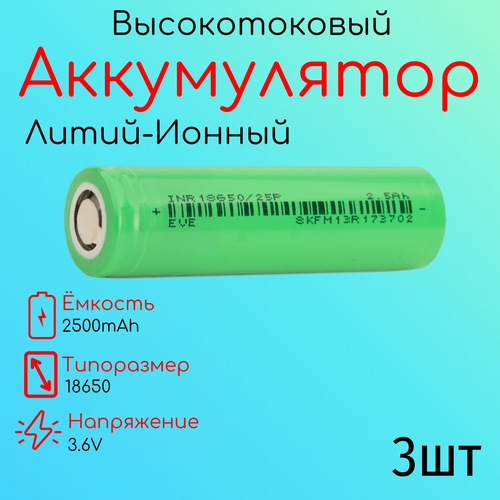 Аккумуляторная батарейка 18650, 2500 мАч, 3 шт