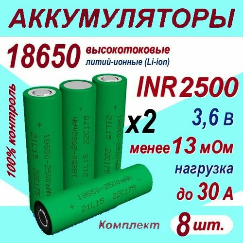 Аккумулятор 18650 Z литий-ионный (Li-ion) INR 2500 высокотоковый, 30A, 13 мОм, комплект 8 шт.