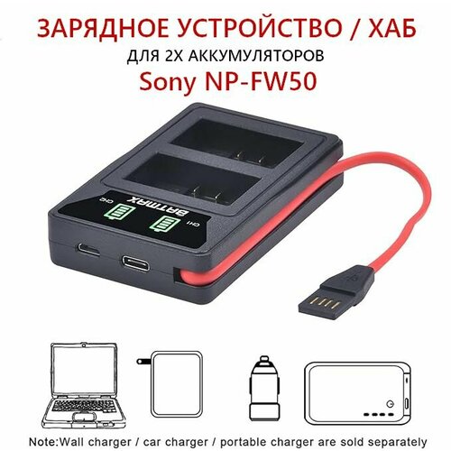 Зарядное устройство / хаб на 2 аккумулятора Sony NP-FW50. Порты USB-C, Micro-USB, встроенный кабель. Новая версия Batmax