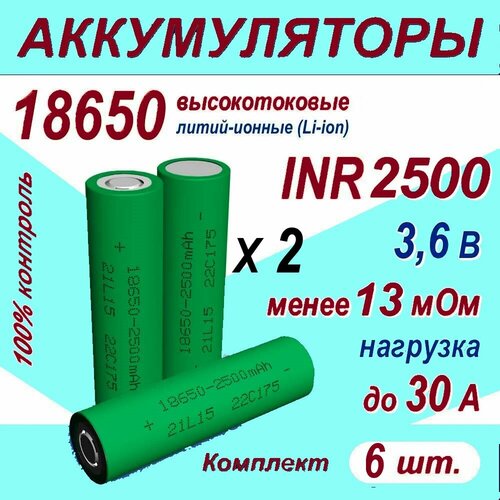 Аккумулятор 18650 Z литий-ионный (Li-ion) INR 2500 высокотоковый, 30A, 13 мОм, комплект 6 шт.