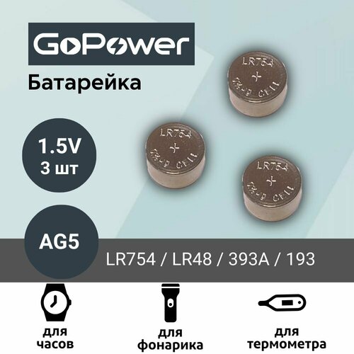 Батарейка GoPower AG5 (LR754, LR48, 393A, 193) Alkaline 1.55V (3 шт)