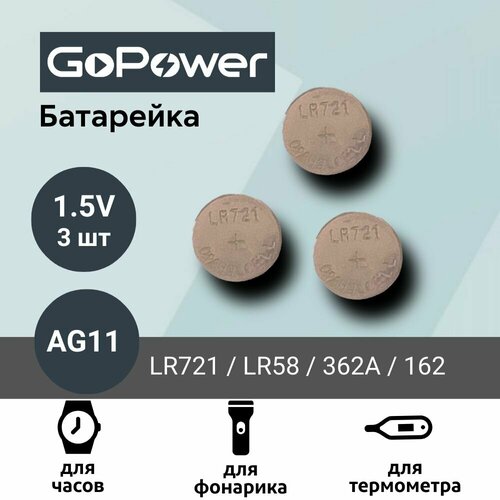Батарейка GoPower AG11 (LR721, LR58, 362A, 162) Alkaline 1.55V (3 шт)
