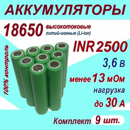 Аккумулятор 18650 Z литий-ионный (Li-ion) INR 2500 высокотоковый, 30A, 13 мОм, комплект 9 шт.