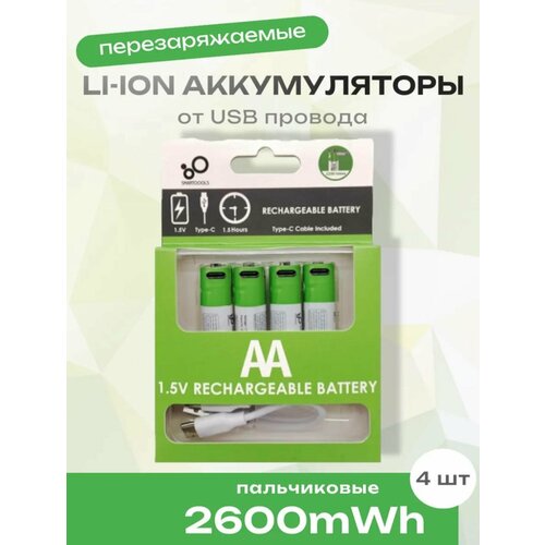 Аккумуляторные батарейки, Li-ion, от USB, -(2600 мА/ч,) пальчиковые, 4 шт