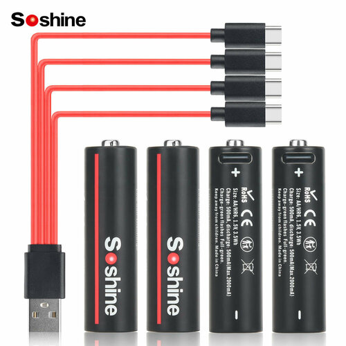 Soshine Аккумуляторные батарейки AA, 1.5 V, 3500 mWh, 4 шт с зарядкой от USB кабеля.