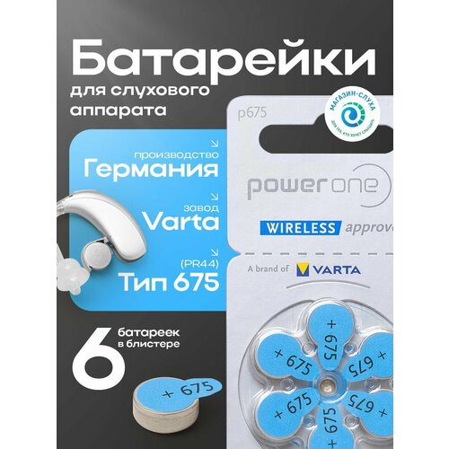 Батарейки для слухового аппарата power one p675, PR44 (ZA675, V675A, DA675) ZincAir (воздушно-цинковый) тип 675, 6 батареек