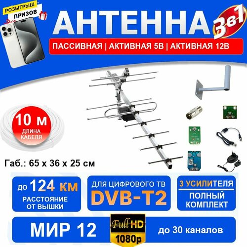 МИР 12 (3 в 1 полный комплект до 124 км) Антенна для приема цифровых каналов, штекер, 5В и 12В усилитель, инжектор блок питания кронштейн кабель